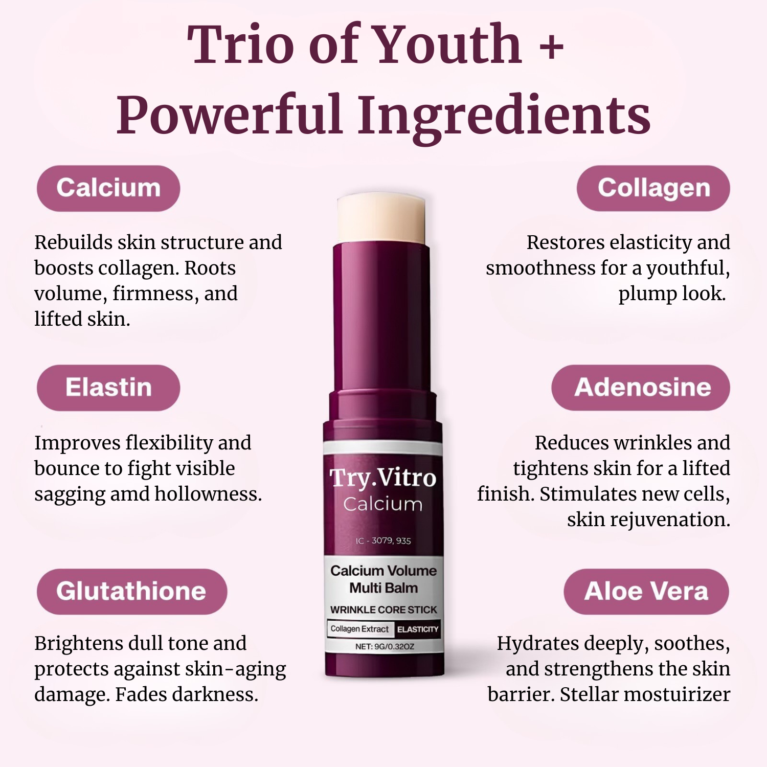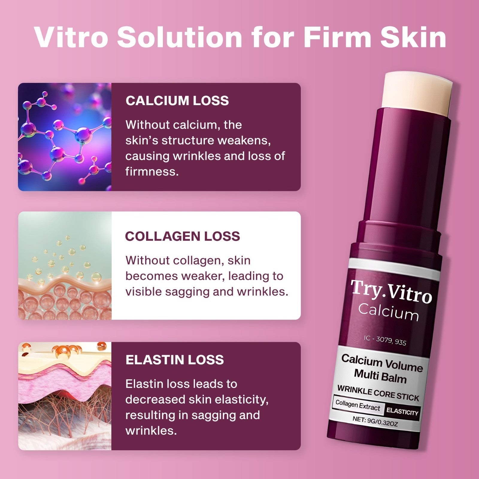 Aging skin loses Calcium, Collagen, and Elastin, causing wrinkles and sagging. Vitro’s balm restores these essentials, strengthens the barrier, improves elasticity, and deeply hydrates — leaving skin firmer, smoother, and visibly youthful.